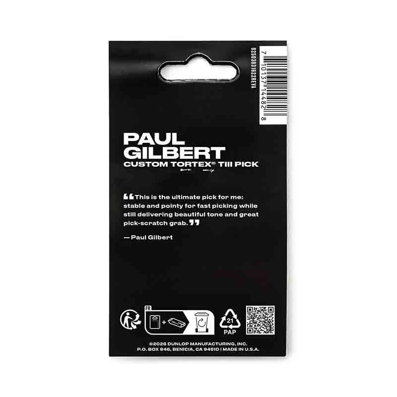 “Paul usa a palheta TIII há anos, então transformamos sua palheta favorita de 0,73 mm em um conjunto exclusivo com seis designs originais criados pelo próprio Paul, incluindo um que celebra o lançamento de seu álbum solo, WROC. Adquira já um pacote de palhetas Paul Gilbert Custom Tortex TIII e transforme seu próximo solo em uma experiência eletrizante.”
